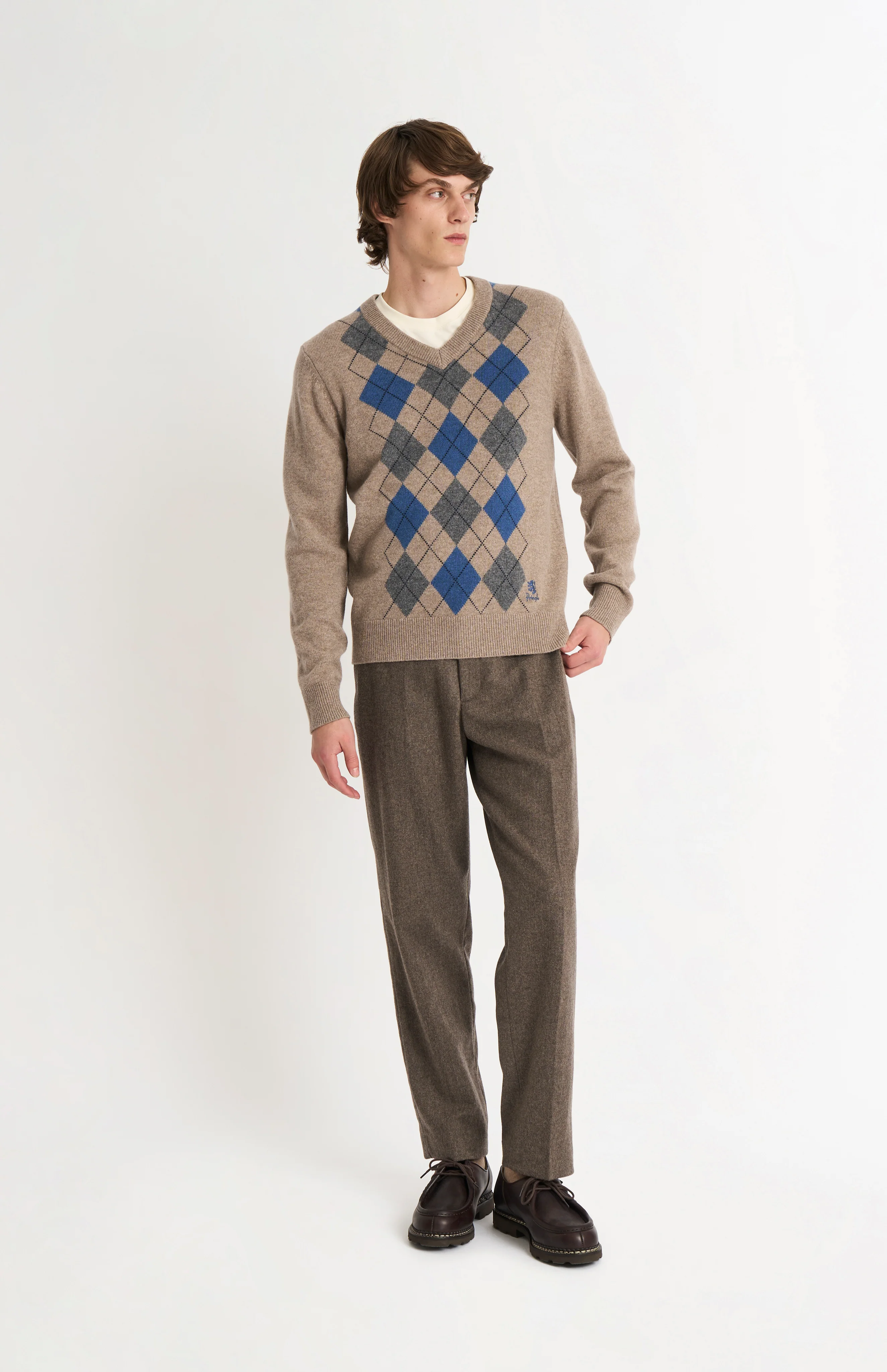 Men's Kessock V-neck Supersoft Lambswool Argyle Jumper In Mushroom / Blue / Grey