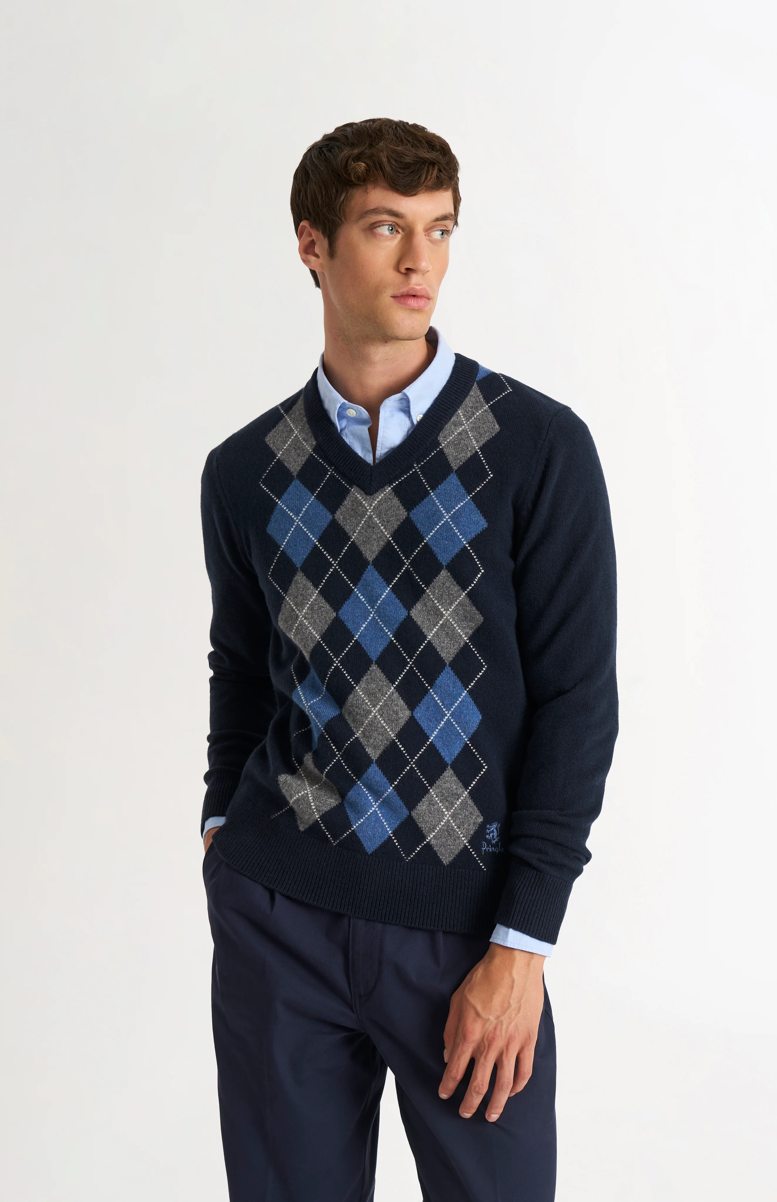 This classic Argyle jumper is inspired by an original design from the Pringle archive and features our signature diamond pattern in Navy Blue, Bering Sea Blue, and Grey Melange, with a subtle raker stitch in Jasmine. A true icon of the 1980s, the Argyle pattern is rooted in Scottish heritage, originally derived from the tartan of Clan Campbell of Argyll in western Scotland. In the 1920s, Pringle pioneered the intarsia knitting technique used to craft this distinctive design, a hallmark of the brand ever since. Reimagined in a contemporary colour palette, the jumper also features our iconic Pringle lion embroidered logo, paired with vintage-inspired typography and subtle house stripe rib detail along the side seam. Made from 100% supersoft lambswool with a luxurious 17.5-micron fibre diameter, the knit offers exceptional softness and a smooth, premium finish.