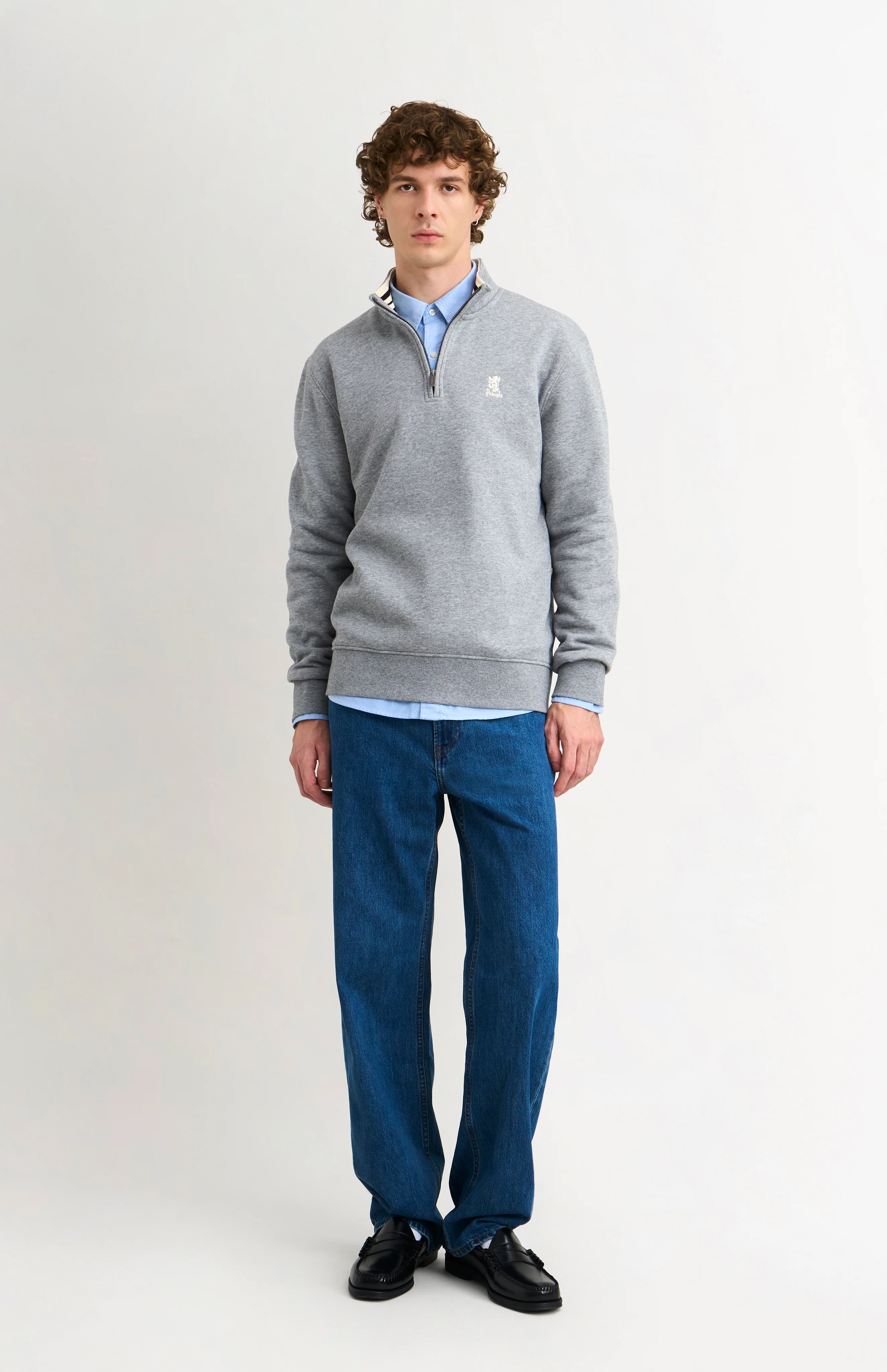 This timeless quarter zip sweatshirt in grey melange defines elevated casualwear - clean, contemporary, and built to last. Designed for everyday comfort, it offers lasting durability without compromising its ultra soft hand feel. The brushed interior delivers an exceptionally smooth touch against the skin, making it your go-to for refined, effortless style. Elevated with thoughtful details, including the signature house stripe back neck tape and lion logo on the chest for a modern, tactile finish. The internal ribbed collar, featuring the house stripe and jacquard-woven logo, adds an extra layer of craftsmanship. The branded brushed metal zip serves as a sleek and functional addition, enhancing both style and practicality. This Qtr zip is a quiet yet confident statement of craftsmanship and quality.