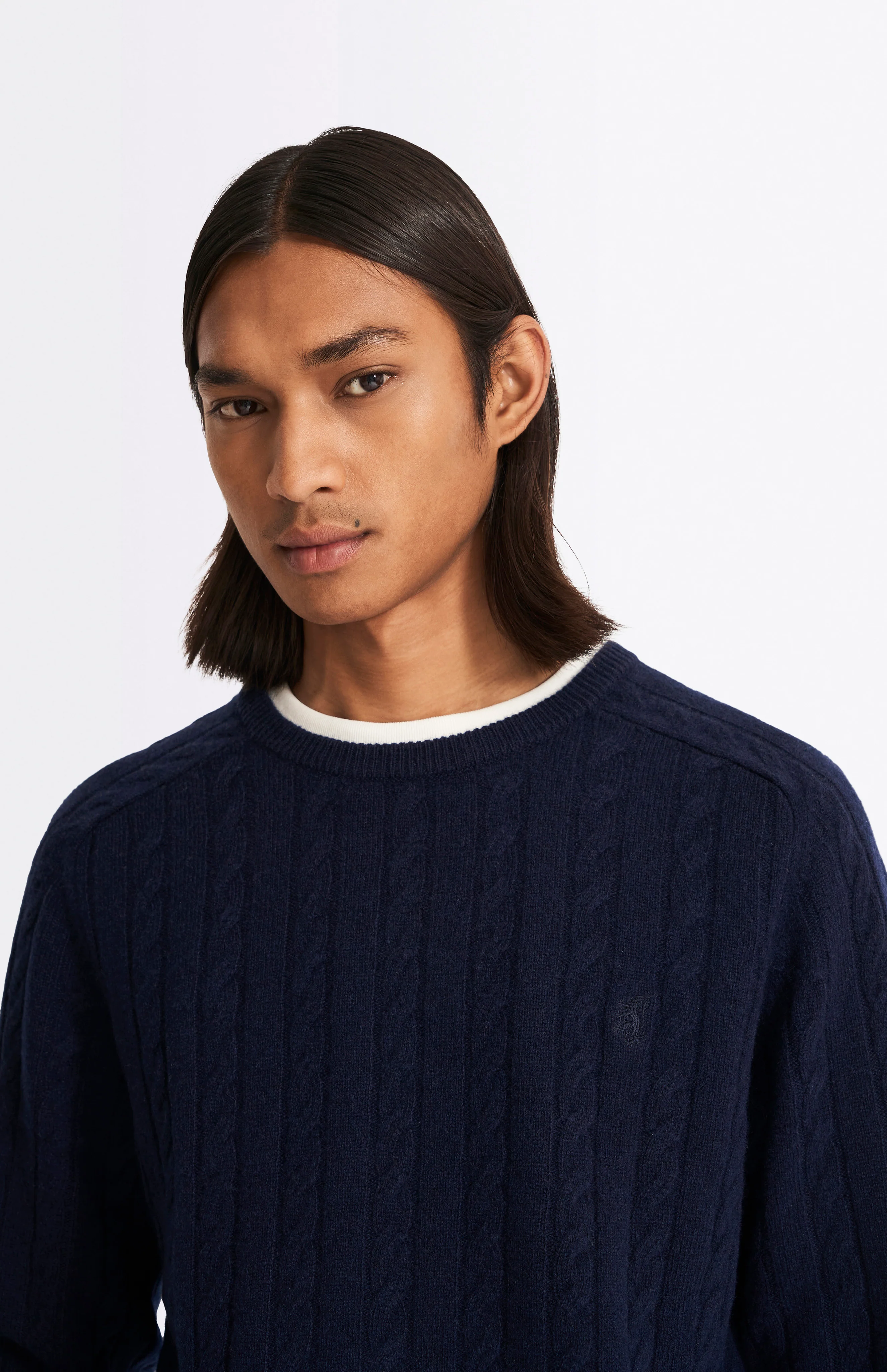 This classic crew neck lambswool jumper in Midnight features a traditional cable stitch. Our signature rib detail adds a subtle twist to the trims and our iconic Pringle lion emblem is embroidered at the chest. Made from super soft 100% lambswool.
