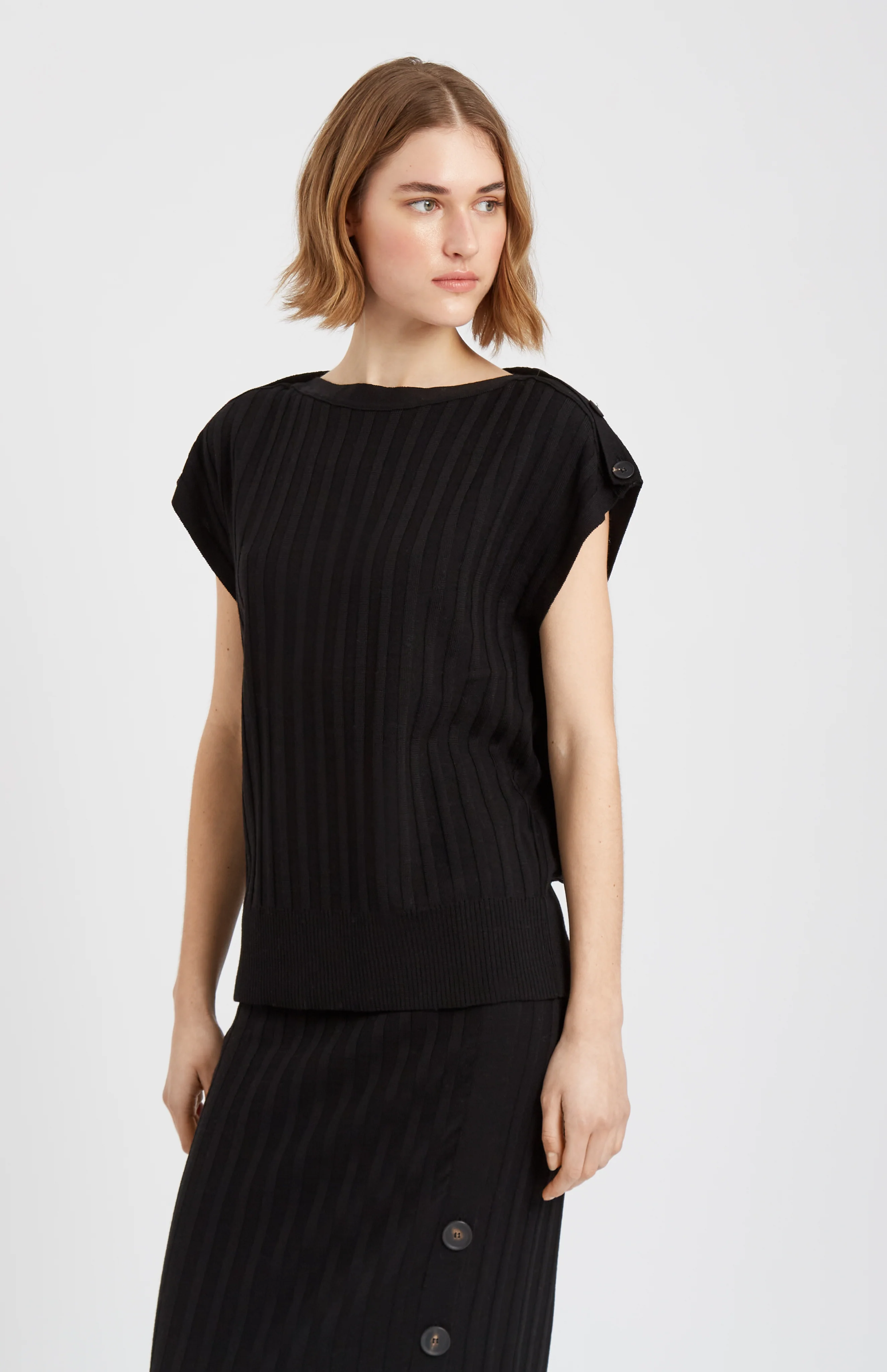 A modern twist on a classic rib, this relaxed fit round neck sleeveless merino jumper in black, features broad rib and tonal contrast Milano stitch detail along the neck and sleeves. The beautiful and feminine boat neck consist of functional buttons.